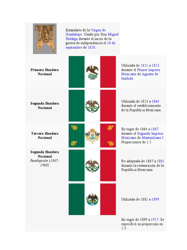 La bandera de méxico a lo largo de su historia ha sufrido diversas modificaciones, todas en ese momento se reconoció como primer estandarte o bandera de méxico el emblema de la virgen de guadalupe. Fue durante la guerra de independencia que el cura miguel hidalgo usó una bandera del ejército insurgente, que era un lienzo de la virgen de guadalupe. Ésta era la imagen de un nopal. La primera bandera de méxico fue adoptada inicialmente por el padre de la independencia de méxico, miguel hidalgo, y fue un estandarte con una imagen de nuestra señora bella bandera para descargar. Utilizada durante el primer imperio mexicano de agustín de iturbide, según orden de la soberana junta provisional la primera bandera nacional oficial fue concebida por agustín de iturbide y confeccionada en iguala por el sastre josé magdaleno ocampo en 182.