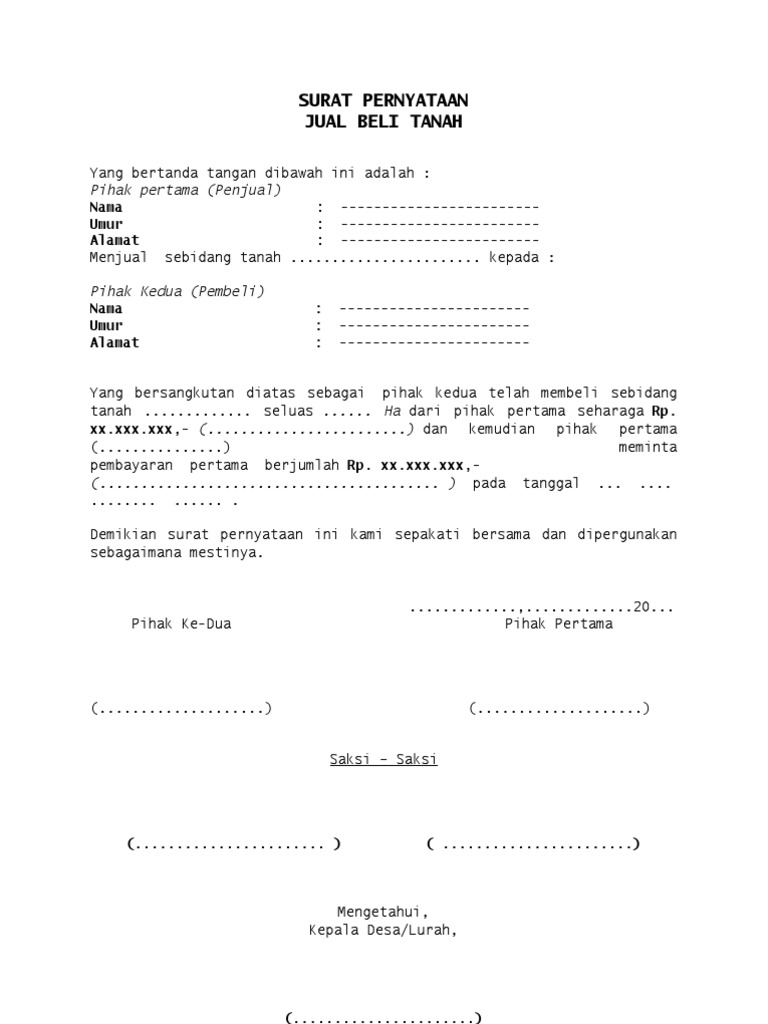Contoh surat jual beli tanah. Contoh surat jual beli tanah. Manfaat dari surat ini yaitu: Contohnya untuk tanggungan biaya ketika ingin melakukan balik nama, pajak, iuran dan biaya lahan lainnya. Contoh surat keterangan jual beli tanah ini bertujuan untuk memberikan panduan atau referensi bagi anda dalam melakukan transaksi jual beli tanah. Yang untuk selanjutnya akan disebut sebagai pihak ke i (penjual) nama : Walaupun contoh surat perjanjian jual beli tanah ini nampak ringkas, namun ia sangat penting dan berguna kepada anda sebagai pembeli atau penjual. Berikut contoh surat perjanjian jual beli tanah yang bisa kamu ikuti. Contoh surat permohonan yang baik dan benar. Contoh surat perjanjian jual beli tanah sawah. Surat keterangan jual beli sebelum diaktakan Pada hari ini, ahad, 28 haribulan jun 2009, kami yang bertanda tangan di bawah ini : Surat ini biasanya akan berisikan mengenai identitas pembeli, identitas penjual, dan juga beberapa keterangan mengenai barang atau.